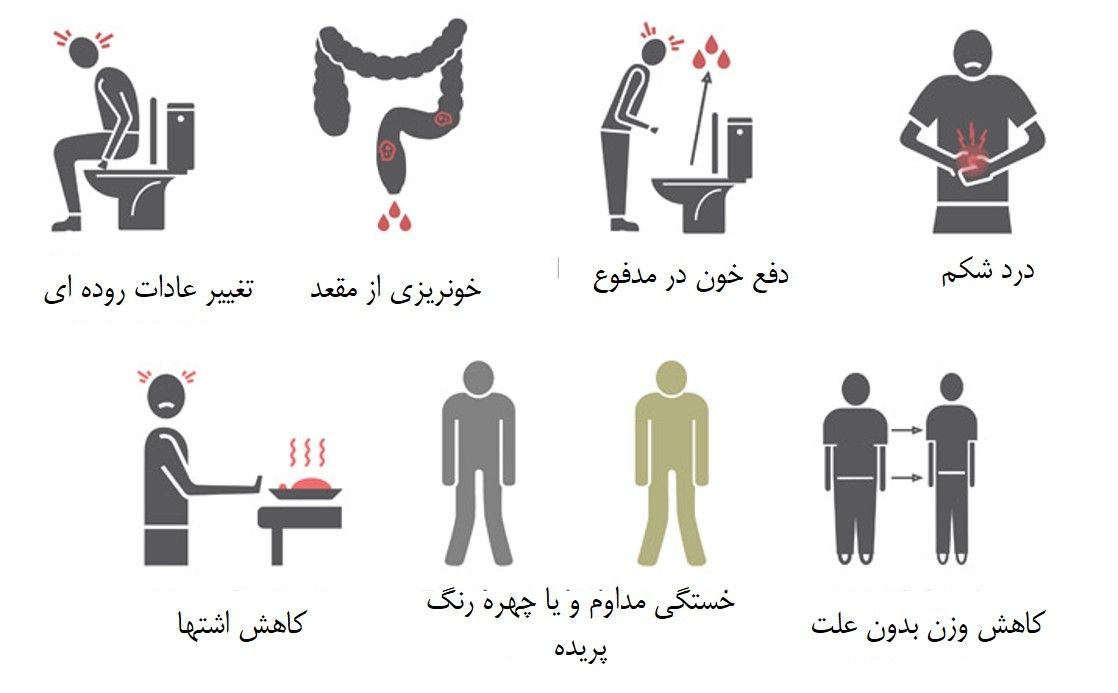افراد مختلف علائم متفاوتی از سرطان سرطان روده بزرگ را ممکن است ذکر نمایند. همچنین برخی افراد اصلاً هیچ علامت یا علامتی ندارند. برخی از علائم هشدار دهنده سرطان روده بزرگ عبارتند از: